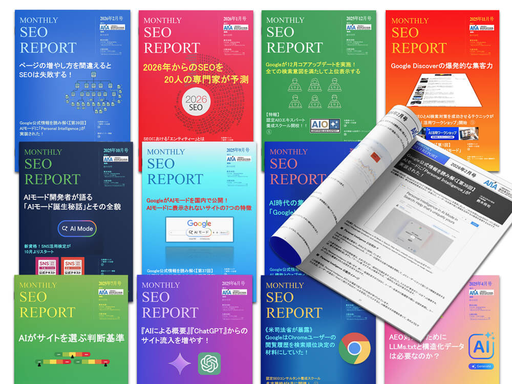 実例を基にした最新SEO対策情報が満載の代表 鈴木将司の『MONTHLY SEO REPORT』 では、 AI検索で自社サイトを取り上げてもらうためのAEO・AIO対策や、Googleで上位表示するSEO対策の具体的な改善提案などに加え、 InstagramやYouTubeなどのSNSを活用した集客を実現するためのレポートをお届けします。