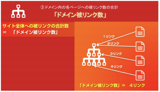 こうした理由から、トップページへの被リンクばかりを集めるのではなく、ドメイン全体への被リンク、つまり「ドメイン被リンク数」を増やすことを心がけて下さい。